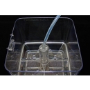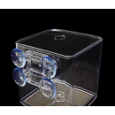 Profi Box mit vielen Extras! Was ist besonders an der Ziss GL-1T Breeding Box? die Halterungen: Sauger: Die Halterung wird mit 4 Saugnäpfen stabil im Aquarium angebracht. Die Box selber kann auf zwei verschiedenen Stufen eingehängt werden. Dadurch, dass die Box einfach eingehangen wird, erspart man sich beim Abnehmen erst mal das meist umständliche Ablösen der Sauger. Hang On Clip: Die Halterung wird stabil am Aquariumrand eingehängt. Die Box selber kann auf sechs verschiedenen Stufen eingehängt werden. Boden aus Edelstahlgaze: Der Boden ist mit Edelstahlgaze Einsätzen versehen. Das optimiert die Wasserzirkulation und sorgt gleichzeitig dafür, dass auch Garnelen (und Babygarnelen) sicher aufgehoben sind. herausnehmbarer Trichter: Der beiligende Trichter kann herausgenommen werden. Das vergrößert das Einsatzgebiet der Box. Man kann damit zum einen Fische verschiedener Größen trennen aber auch frisch geschlüpftem Nachwuchs Schutz vor den Elterntieren gewähren. optionaler Luftanschluss: Die Ziss Breeder Box hat einen optionalen Luftanschluss. Auch hier der besondere Vorteil - der Luftanschluss kann verwendet werden - muss aber nicht. Geliefert wird die Box mit Sprudelstein und Luftregler. Mit einem Luftschlauch (nicht im Lieferumfang aber in gewünschter Länge hier erhältlich) kann eine kleine Membranpumpe angeschlossen werden. Somit kann eine noch bessere Zirkulation des Wassers erreicht werden. Zudem wird dadurch die Sauerstoffversorgung in der Box verbessert. Sollte bereits zur Filterung des Aquariums eine Membranpumpe verwendet werden, kann man auch mit dieser über einen Luftverteiler den Sprudelstein der Breeding Box betreiben. Wer den Luftanschluss nicht nutzen möchte lässt ihn einfach weg. Eine wirklich gelungene Breeding Box. Gleichermaßen geeignet für Garnelen- und Fischhalter. Perfekt durchdacht - hochwertig verarbeitet - umfangreiches Zubehör Lieferumfang: 1 Breeding Box, Halterung mit 4 Saugern, Hang On Clip, Trichtereinsatz, Sprudelstein, Luftregler, Abdeckscheibe Text und Bilder © Garnelengarten-Bayern.de - Verwendung von Text und Bildern nur nach Absprache